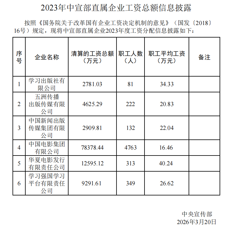 2023年中宣部直属企业工资总额信息披露-中国文明网