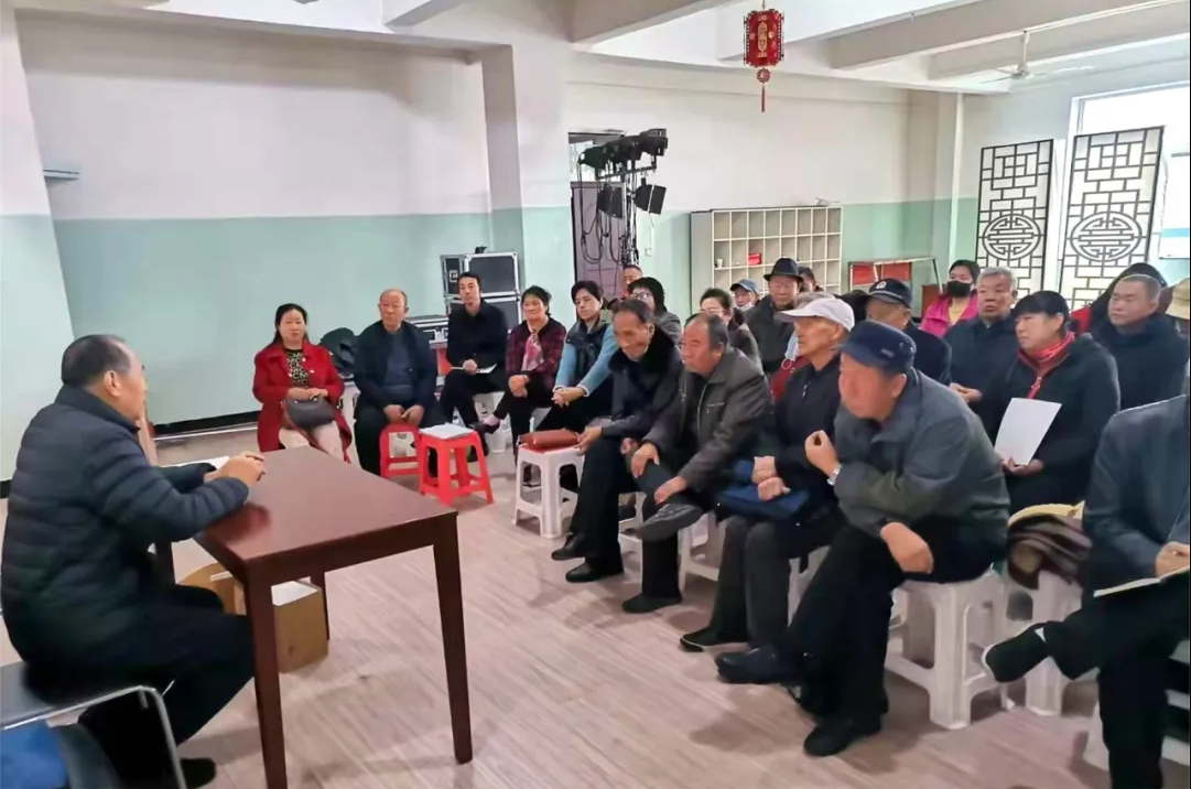 原平农民散曲社散曲创作辅导课堂。原平农民散曲社以精神文明实践为宗旨,以文化服务大众为中心进行散曲创作,通过贴近群众、贴近生活的散曲艺术形式,把新思想、新风尚播种到群众心坎上(资料图)。(原平市文明办供图)
