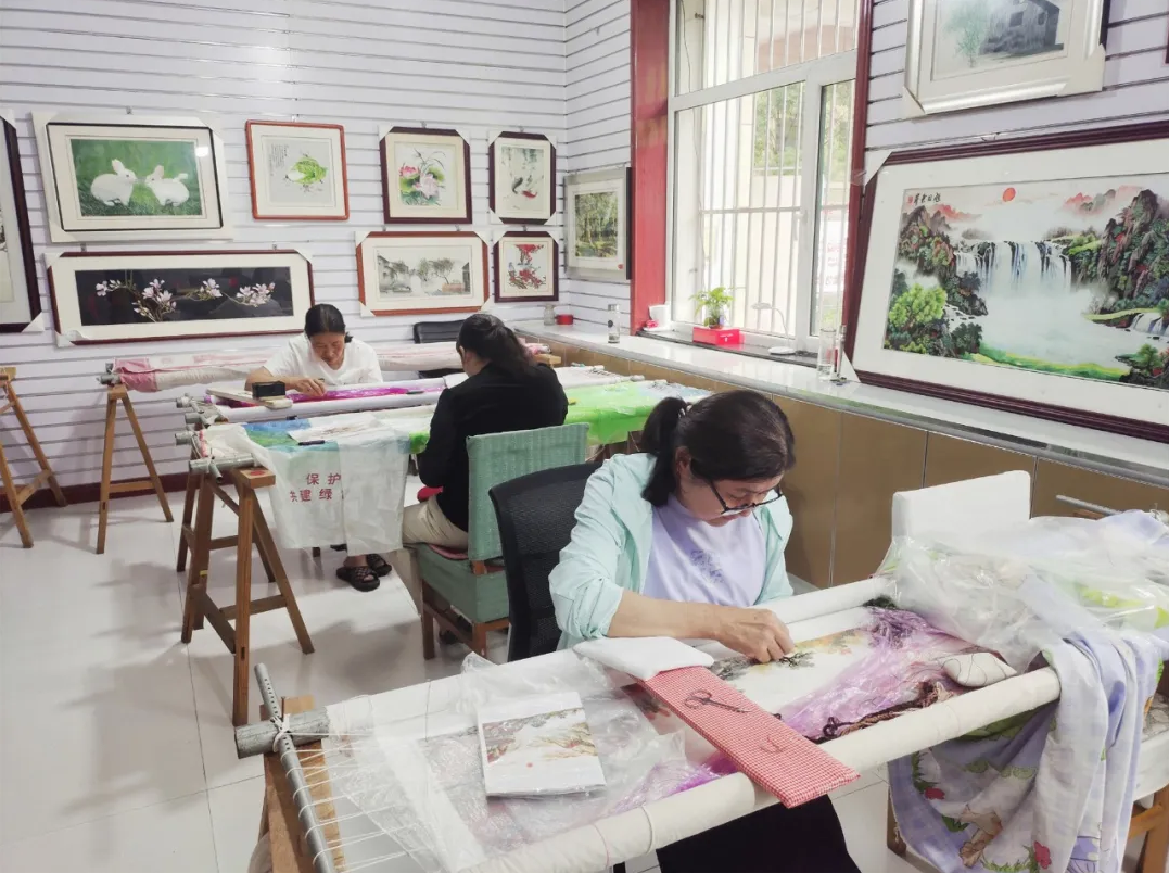 8月8日,在静乐县鹅城镇新时代文明实践所,村民正在认真刺绣。新华网发(忻州广播电视台 王鹏宇 摄)