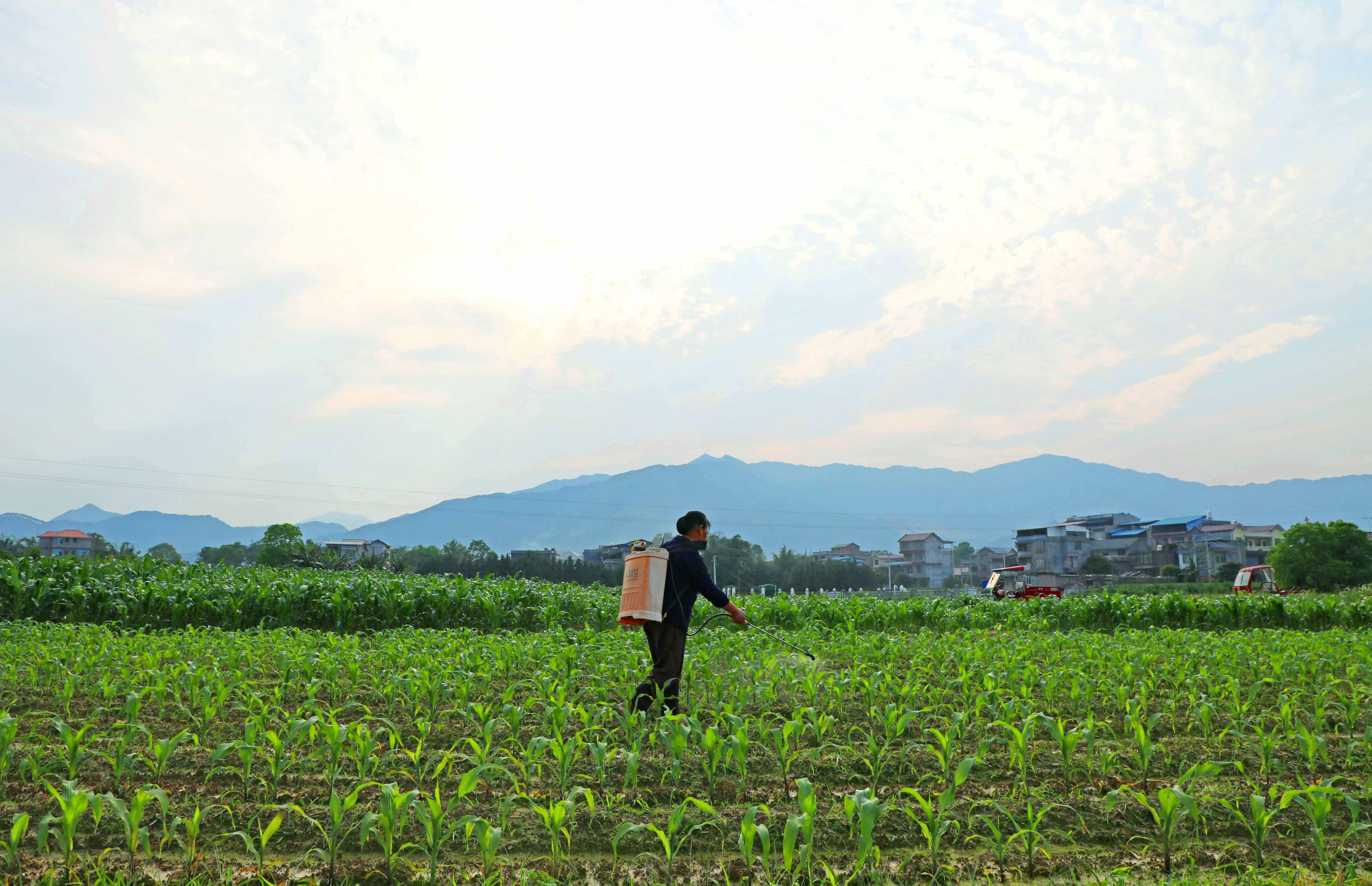 村民正在为玉米喷洒除草剂。
