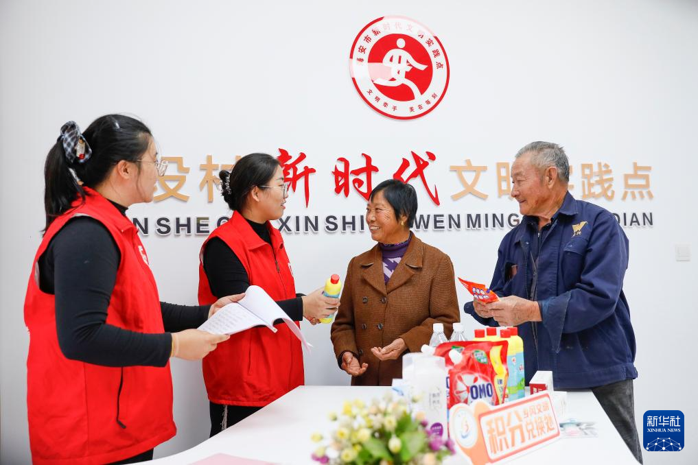 10月25日,江苏省海安高新区隆政街道建设村村民凭文明乡风积分存折兑换日用品。新华社发(顾彬斌 摄)
