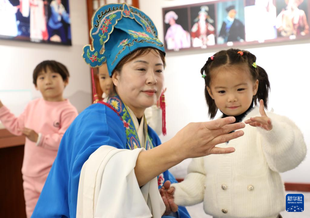10月27日,在山东省滨州市博兴县吕艺镇“吕剧起源展览馆”,吕剧演员指导小朋友学习传统吕剧表演动作。新华社发(陈彬 摄)