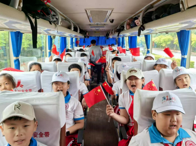 学生们在前往研学点位的大巴车上欢快歌唱。
